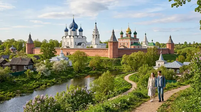 Звенигород часто выбирают за его кажущуюся доступность — всего час от Москвы без пробок. Но май раскрывает его главное преимущество: холмы вокруг Саввино-Сторожевского монастыря (музейный комплекс внутри — 500 рублей) покрываются свежей травой и цветами, создавая пейзажи, которые невозможно увидеть в другое время года. Если приехать не в самое пиковое время (например, в будний день майских праздников), можно насладиться не только архитектурой, но и прогулками по окрестным тропинкам без необходимости бороться за парковку. Сам город Звенигород предлагает уютные кафе и мастерские, где можно попробовать местные пряники и рыбу из Оки (чек в кафе — 1200-1800 рублей). Маршрут на один день: монастырь, прогулка по холмам, затем возвращение в город для обеда.